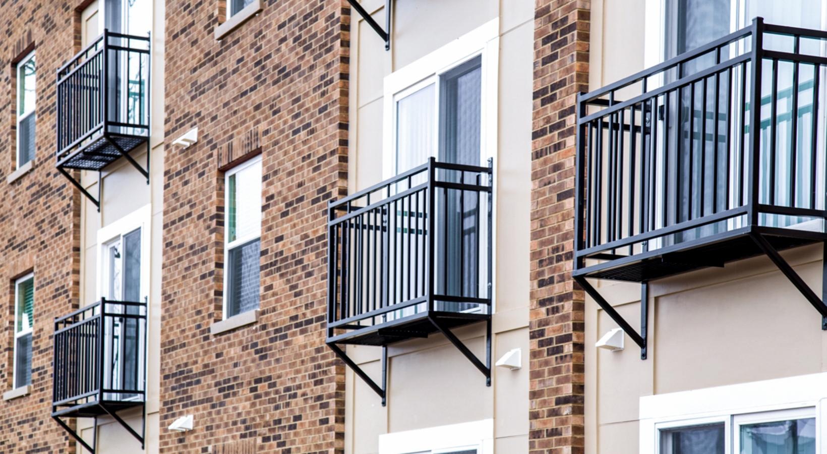 • a couple of balconies on a brick building