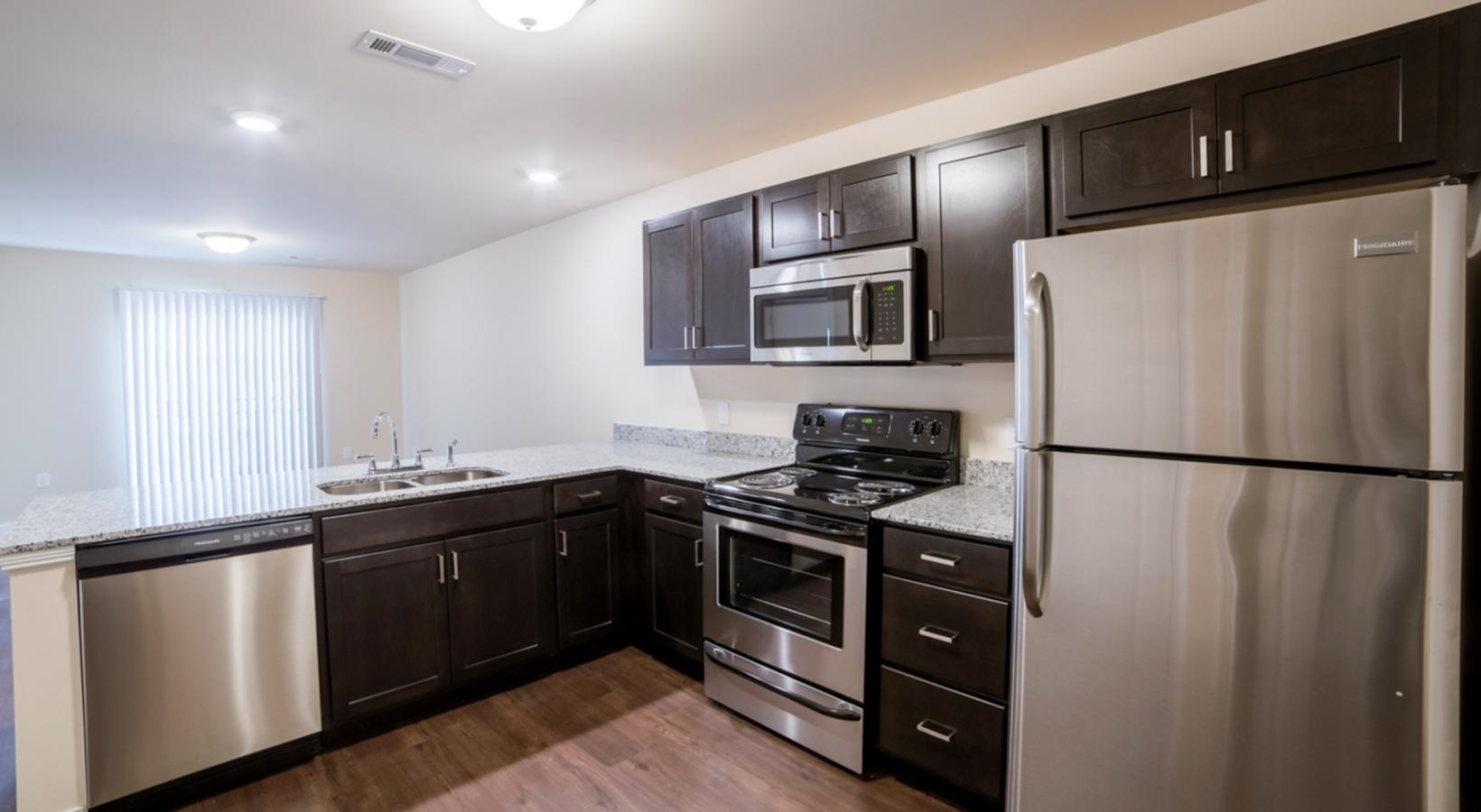 • a kitchen with stainless steel appliances
