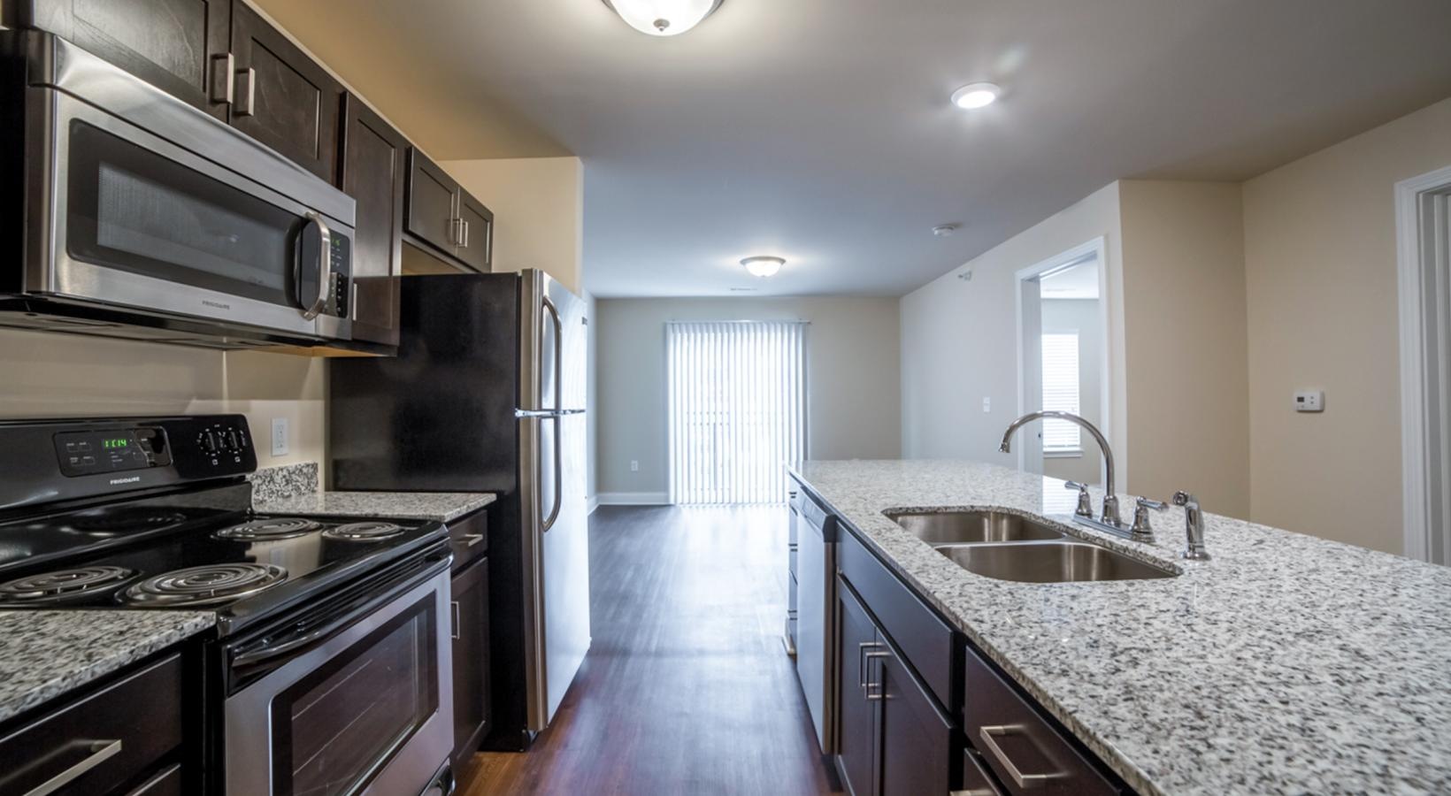 • a kitchen with black appliances